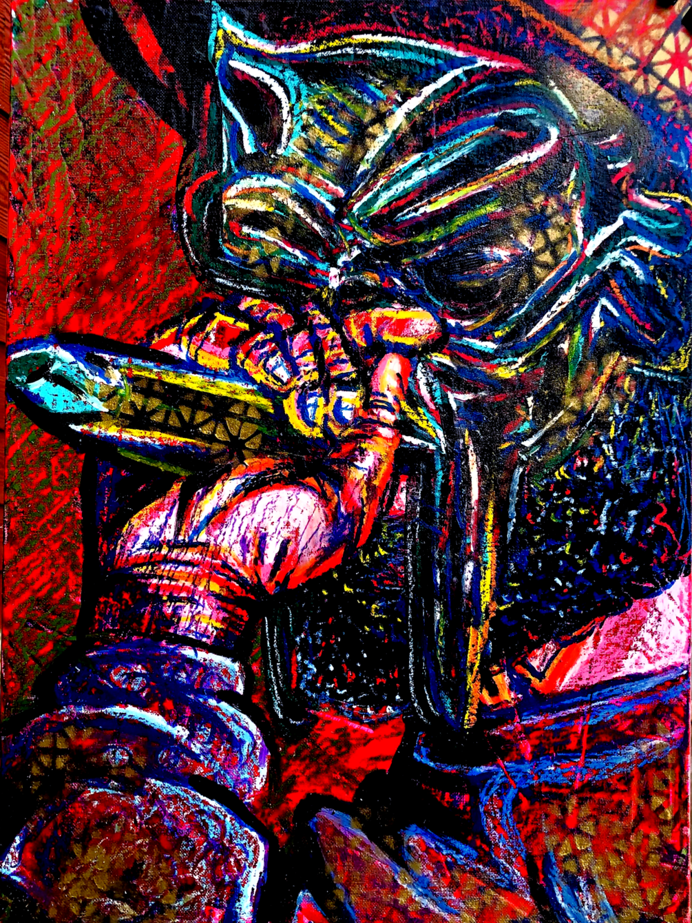 16in by 20in. Oil Pastel on black treated canvas panel. Portrait of late great music artist MF DOOM. Framed and ready to be hanged.